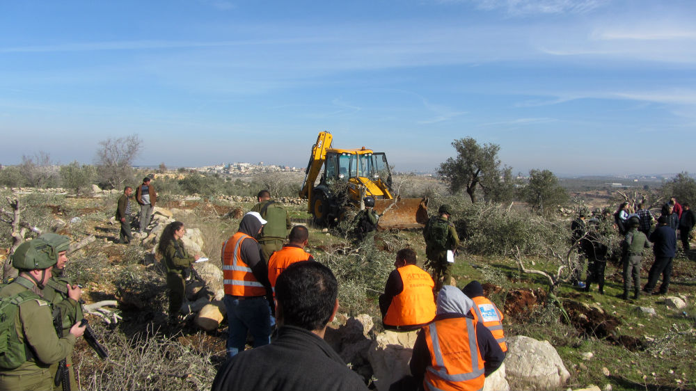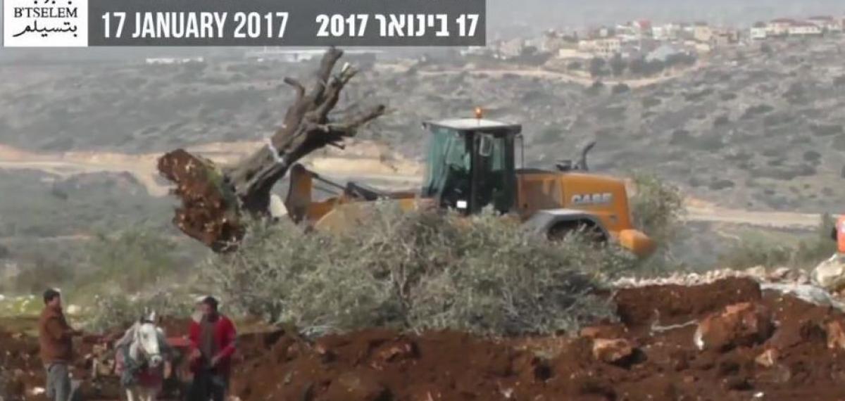 Civil Administration forces uproot olive trees on ‘Azzun village land. Photo by Abdulkarim Sadi, B'Tselem, 16 Jan 2017