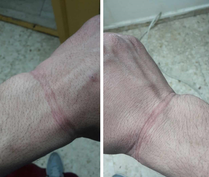 وصل محمّد أوّلًا إلى منزله الذي يبعد عن البرج نحو 150 مترًا فقط، وهناك أزلتُ العصابة عن عينَيَّ وواصلتُ طريقي إلى منزلي وجسدي كلّه يتألّم بشدّة. في المنزل قصّ أخي طارق الأصفاد بسكّين وأزالها عنّي. تركت الأصفاد علامات واضحة حول المعصمين. أعتقد أنّ الجنود احتجزونا وهاجمونا من أجل التسلية فقط.