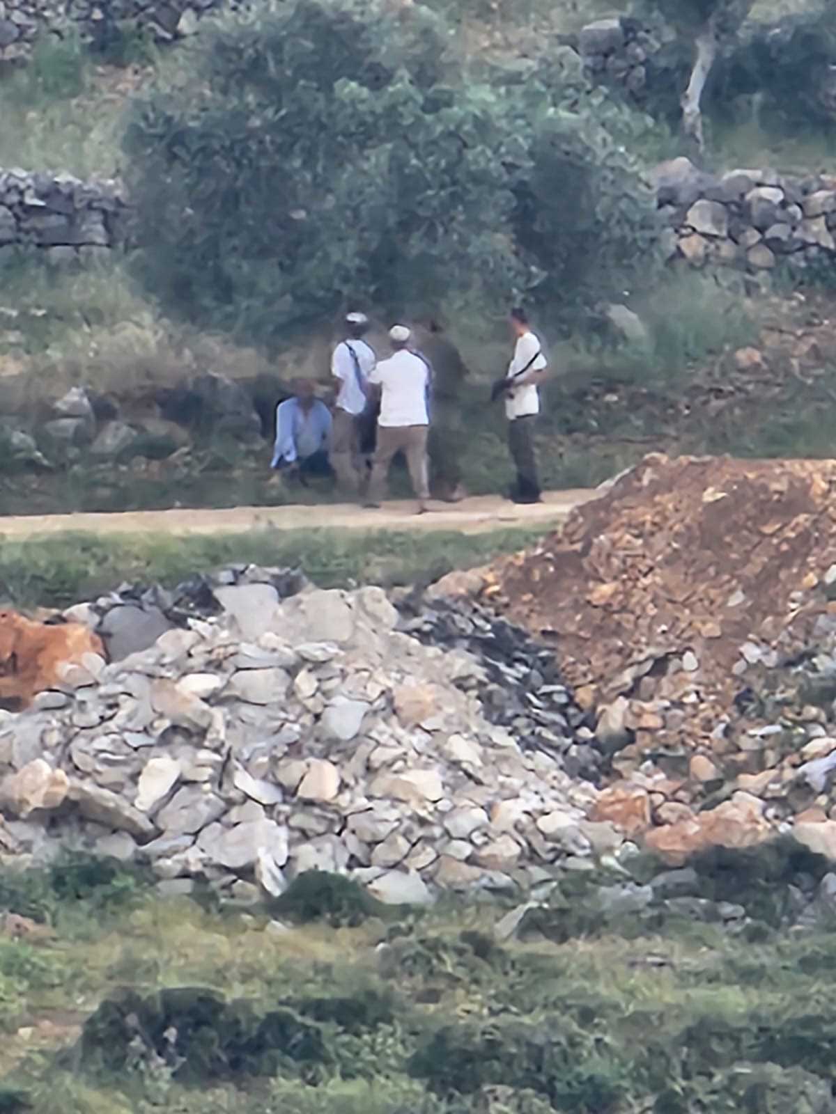 على الفور، جاء إلى هناك عدد آخر من المستوطنين بدوا كأنهم متدينون، معظمهم مسلحون. أخذوا هاتفي مني وبدأوا بتفتيشه. ابتعد الرجل بالزي العسكري وأحد المستوطنين ثم عادا بعد حوالي عشر دقائق وهما يقتادان عمي "ع. ع." (53 عامًا) الذي يسكن في مكان قريب. أجلساه بجانبي في الوضعية نفسها، على ركبتيه، وسألاه عن هاتفه الذي لم يكن بحوزته ثم جره أحد المستوطنين بعنف إلى منزله ليحضر هاتفه. عادوا خلال أقل من عشر دقائق.
