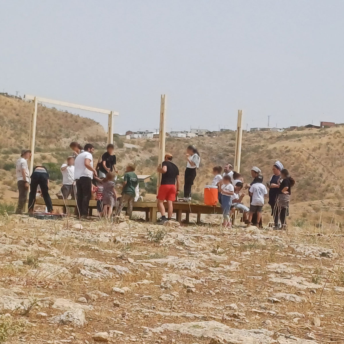 في 1.5.25، وصل عشرات المستوطنين، بمن فيهم جلعاد عموسي، إلى تلة قريبة من التجمع، وأقاموا عليها عريشة خشبية على بعد حوالي 50 مترًا إلى الشرق من مجمع السكن. قبل ذلك بحوالي عشرة أشهر، في 11.7.24، قام ديدي عموسي، والد جلعاد، من مستوطنة "حفات طنا يروك"، ودانيئيل ران، قائد الأمن في مستوطنة "روتم"، واللتين أقيمتا على الجانب الآخر من شارع 578، على بعد حوالي كيلومتر واحد جنوبي شرق تجمع نبع غزال، بشق طريق من مفترق "روتم" غرباً حتى التل نفسه، وأقاموا عليه حاجزين خرسانيين. بالإضافة إلى ذلك، بدءًا من أيار 2024، وفي مناسبات مختلفة، قام المستوطنون بوضع 4-5 قضبان حديدية عليها أعلام إسرائيل على التل نفسه وحول التجمع، على بعد حوالي 30-50 مترًا من المنازل.