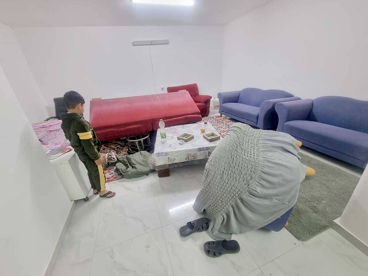 اعترض الجنود طريقي إلى غرفة ابننا نعيم (35 عامًا) الذي يسكن معنا في الشقة مع زوجته وأطفالهما الثلاثة، وقام بعضهم باقتحامها وهم ما زالوا نائمين. بعد عدة دقائق، أخرج الجنود نعيم من هناك ويداه مقيدتان بقيود بلاستيكية واقتادوه إلى إحدى الغرف في البيت. وبعد عدة دقائق أخرى، أخرجوا من هناك أيضًا زوجته وأطفالهما: موسى (8 سنوات) ومريم (4 سنوات) وسارة (3 سنوات) وكانوا يبكون ويرتجفون من الخوف. بعد ذلك أدخل الجنود أيضًا ابنينا الآخريَن اللذين يسكنان معنا، يوسف (17 عامًا) ونعمان (26 عامًا) وأجلسونا جميعًا معًا في غرفة الضيوف.