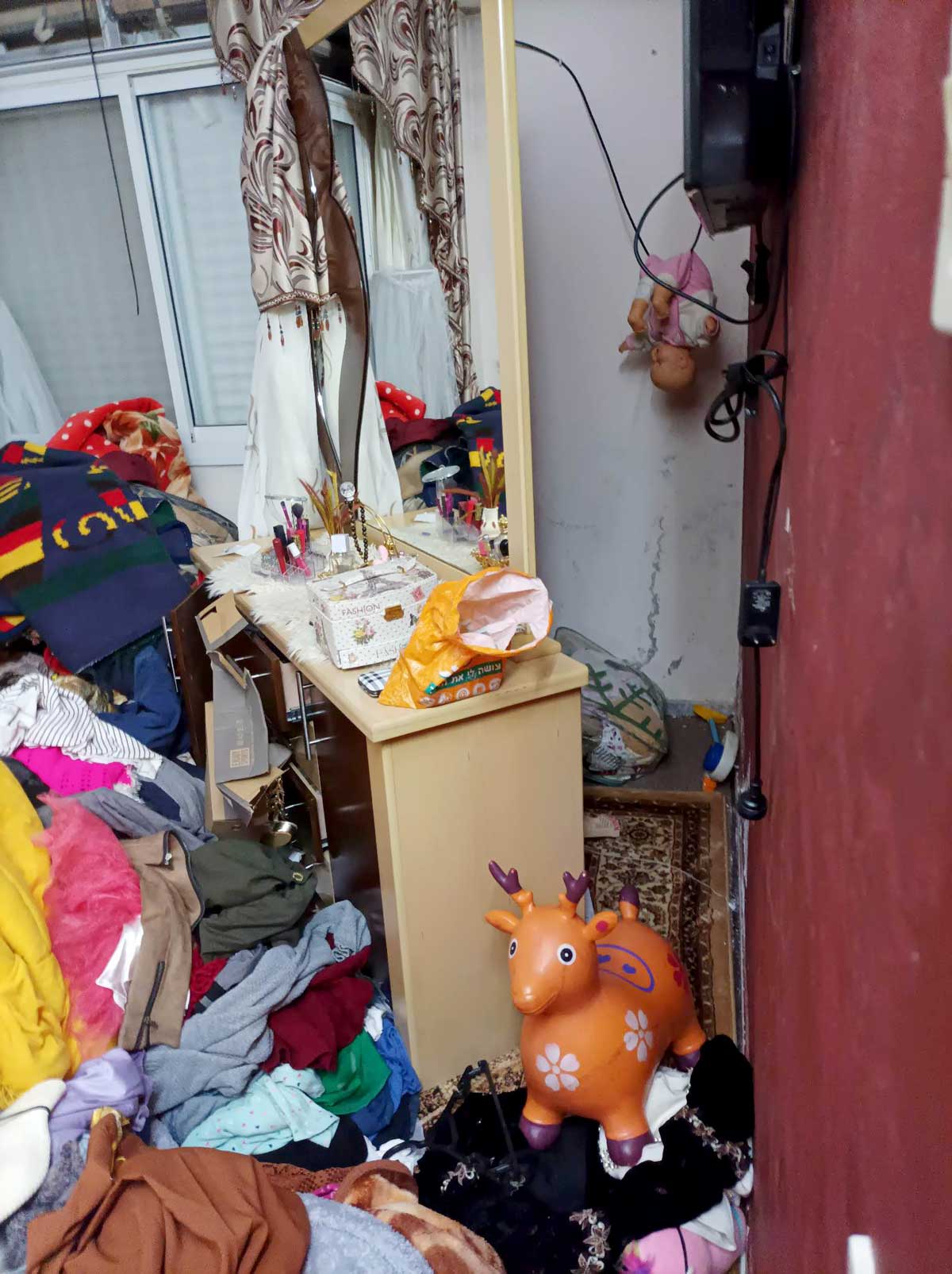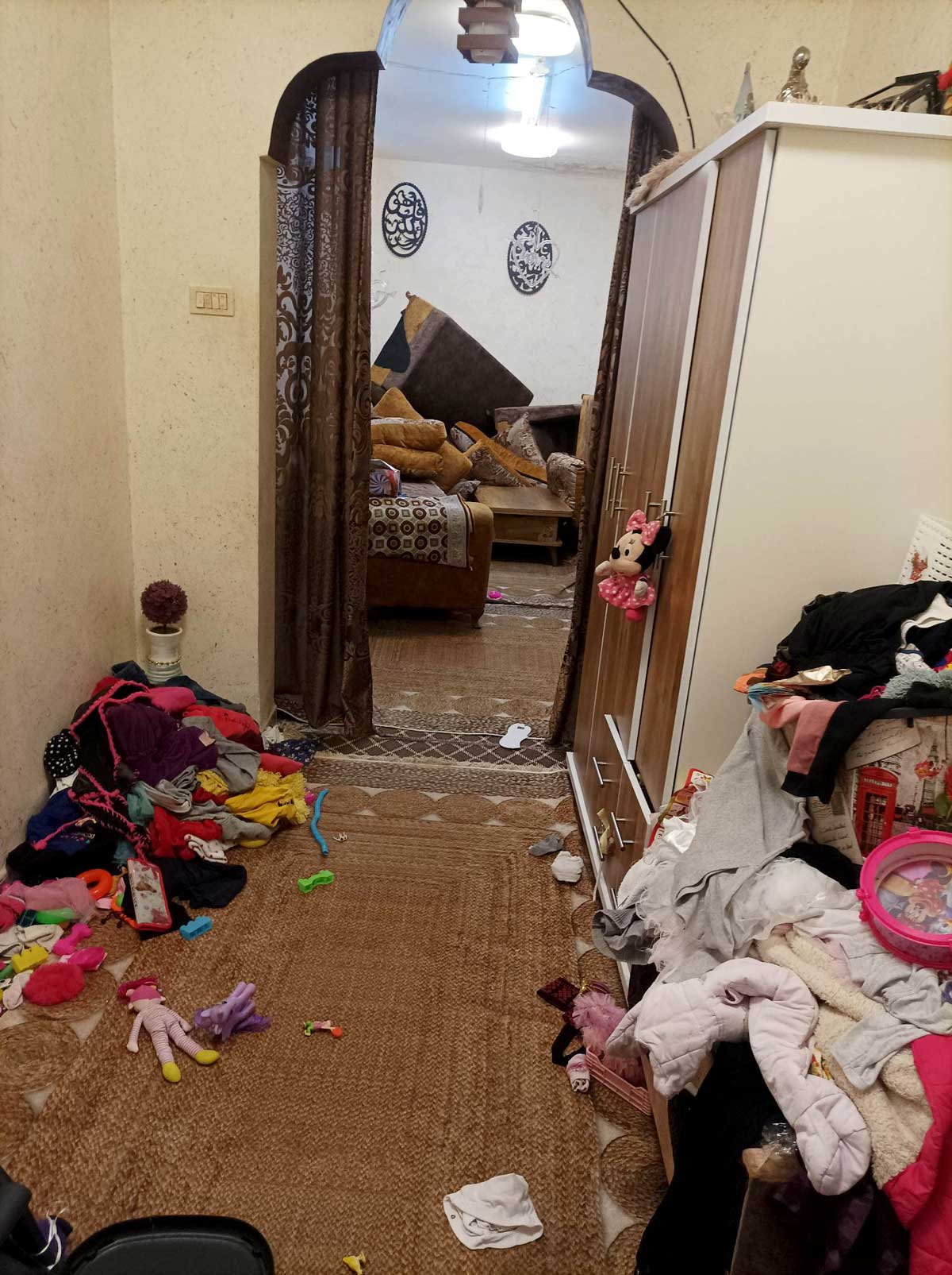 بعد مغادرة الجنود وجدنا أنهم كسروا حائط جبس في البيت، أوقعوا الخزائن في غرفة النوم وأحدثوا حالة من الفوضى في البيت. اكتشف والد زوجي أن الجنود سرقوا 2,000 شيكل كان قد خبأها خلف الجوارير في غرفة نومه. لقد مزقوا الأرائك وقلبوها وخربوا الستائر والثريات في شقتهما. كما خرّب الجنود شقة شقيق زوجي، الذي يسكن أسفل شقتنا، وقد اكتشف هو الآخر أيضًا أنه بالإضافة إلى مجوهرات زوجته الذهبية، التي تزن حوالي 70 جرامًا، سرقوا منه أيضًا 2,600 شيكل نقدًا كان يحتفظ بها في البيت.