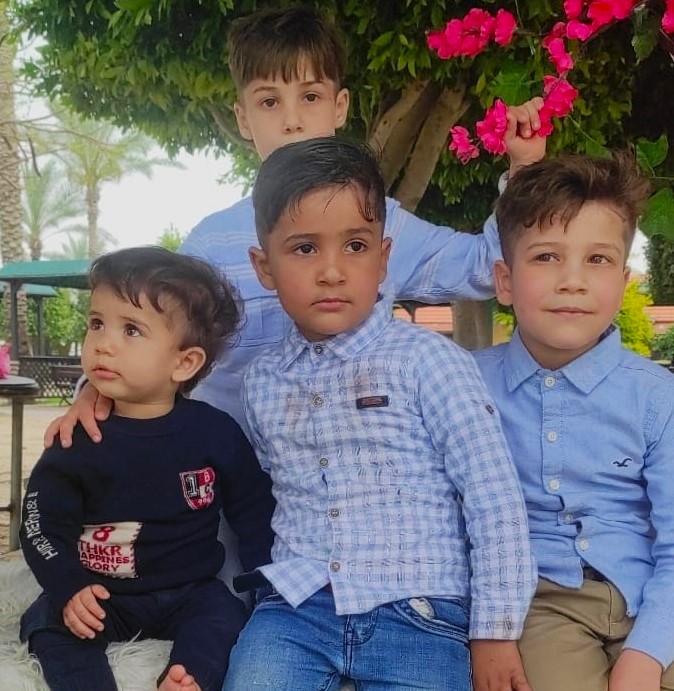 أنا وزوجتي، رنا أمين القصّاص (32 عاماً) أنجبنا خمسة أولاد: يحيى، 9 سنوات ومحمد، 8 سنوات وسفيان، 5 سنوات وأمين، سنتان ونصف وعائشة، 23 يوماً. قبل الحرب كنّا نقيم في بني سهيلا، شرقيّ خان يونس، والآن نحن نازحون على شاطئ البحر في مواصي خان يونس، ونقيم في خيمة من القماش والنايلون.