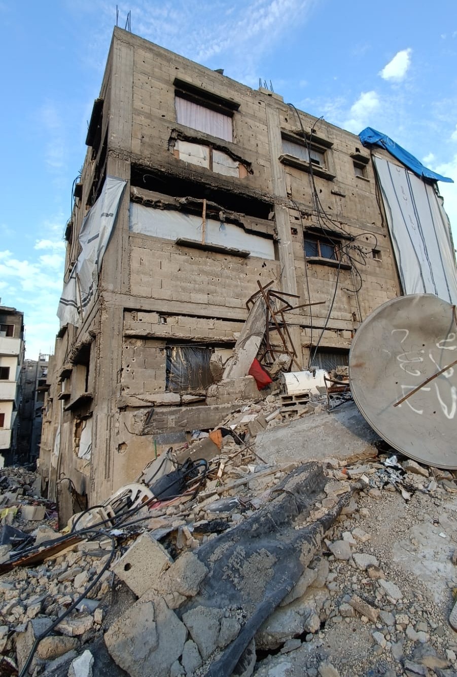 نحن نحاول في كلّ يوم أن نُرمّم قليلاً ونُخلي الرّكام من الشقق، لكنّه أمرٌ صعب في غياب الأدوات المناسبة. نحن نضطرّ إلى حمل ونقل الرّكام بأيدينا. أحاول أن أسدّ الشقوق في الحيطان المهدّمة بطريقة أفضل، باستخدام الشوادر والبطانيّات التي أنتزعها من بين أنقاض البناية، على أمل أن تصبح الشقّة في وضع يسمح بانتقال زوجتي والأولاد إليها.