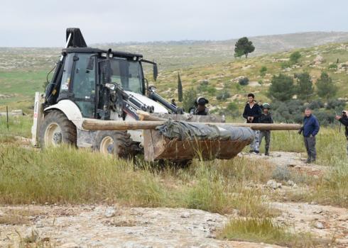 At about 10:00 A.M. this morning, Thursday 2 May 2019, Civil Administration personnel came with a military and Border Police escort to the Palestinian community of Khirbet Susiya in the South Hebron Hills. They brought two bulldozers with them. For the fourth time in just over two weeks, the troops dismantled and confiscated a tent that served as the seasonal home of a family of three. From Khirbet Susiya the troops then went to the community of Khirbet Um al-Kheir where they demolished a shed that served as a sheep pen.