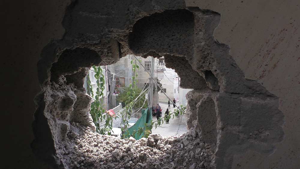 The hole made by soldiers in the wall of Bajes al-Hamuz’ home. Seen below are women standing at the spot where the sniper killed Muhammad Abu Hashhash, at the entrance to his home. Photo by Musa Abu Hashhash, B’Tselem, 16 Aug. 2016