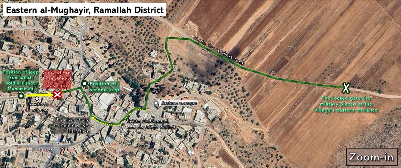 Yet the only fire from Palestinian was fireworks, and in any case, it occurred more than two hours earlier. In addition, at the time Na’asan was shot, he was dozens of meters away from the soldiers, who were inside an armored vehicle, and the claim that they were in any danger is utterly unfounded.