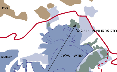 מפה המתעדת את מיקומה ואת התפתחותה של ההתנחלות מודיעין עילית, ואת הגידול באוכלוסייתה בין השנים 2001-2009. מידע נוסף בנושא