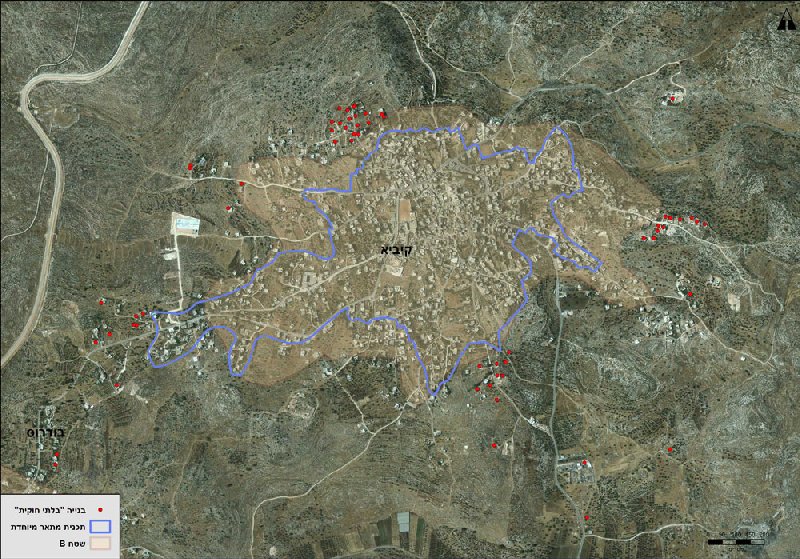 תצלום אוויר של הכפר קיביה שעליו מסומנים גבולות תוכנית המתאר משנת 2007 וכן הבנייה ה"בלתי חוקית" וגבולות שטח B.