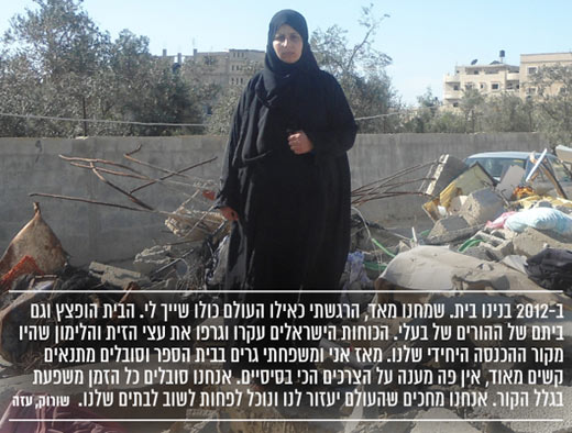 ילדתי את הבת שלי ביום שישי ה-01.08.14, בבית החולים מובארכ. בזמן שהייתי שם בעלי סיפר לי שהבית שלנו הופצץ וגם הבית של ההורים שלו. הוא אמר שהכוחות הישראלים גם עקרו וגרפו את עצי הזית והלימון שהיו לנו מסביב לבית, שהיו מקור ההכנסה היחידי שלנו. מאז אנחנו גרים בבית הספר. היה לי מאוד קשה אפילו ללכת לראות מה נשאר מהבית, כי פחדתי שלא אוכל לשאת את המראה. לא היו לי כוחות לראות איך עבודה של שנים, של בעלי ושלי, אבדה ברגע אחד בלי שום הצדקה, מבלי שעשינו שום דבר. לי ולמשפחה שלי יש הרבה זכרונות יפים מהבית ולא רציתי שיתקלקלו.