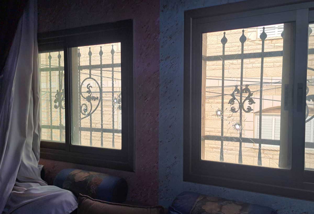 Bullet holes in the living room windows. Behind them are the windows of the a-Sukar home where the soldiers were positioned. Photo: Abdulkarim Sadi, B’Tselem