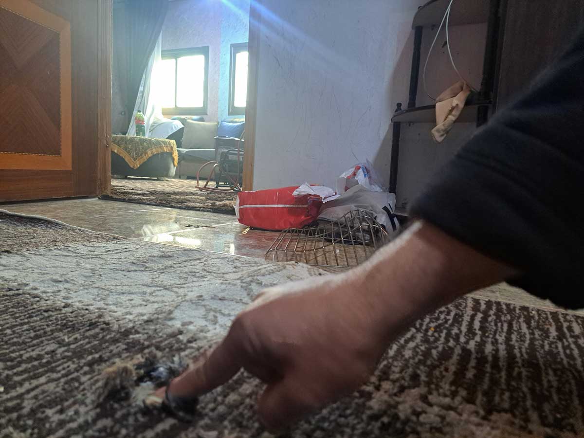 The hole in the girls’ room made by the bullet, which entered through the living room windows seen in the background. Photo: Abdulkarim Sadi, B’Tselem