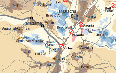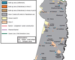 This comprehensive map depicts the updated route of the separation barrier, checkpoints, Palestinian localities, and settlements and settlement outposts in the West Bank.