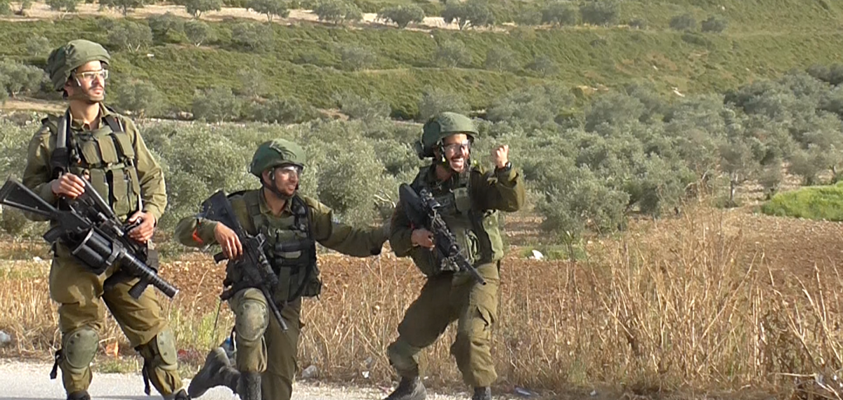 Israeli soldiers cheer after shooting a Palestinian protester in the village of Madama