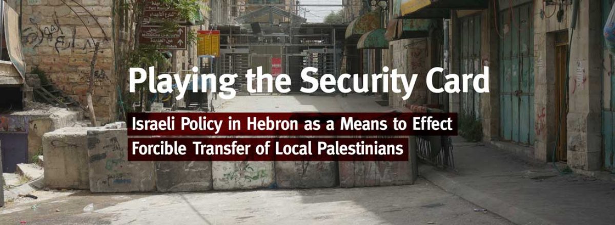 A new B’Tselem report released today, Playing the Security Card: Israeli Policy in Hebron as a Means to Effect Forcible Transfer of Local Palestinians, demonstrates how Israel has been using security excuses to implement a policy that has made life unbearable for the Palestinian residents of Hebron’s city center (the Old City), in an effort to drive them from their homes. This policy relies on the extreme regime of separation Israel has been implementing in the city for the past 25 years – ever since the massacre of Palestinians carried out by Baruch Goldstein – so as to enable a small number of settlers to live in the heart of a crowded Palestinian city. This policy violates the prohibition against forcible transfer, which constitutes a war crime.