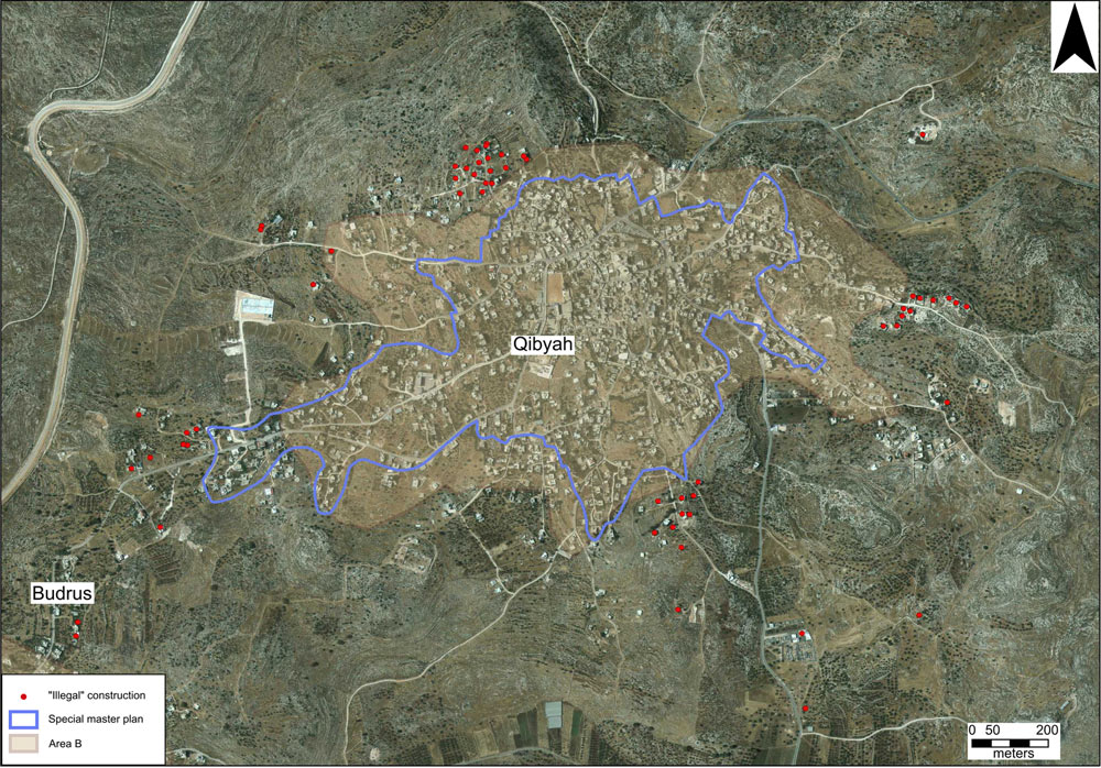The village of Qibyah is located in the central West bank, west of Ramallah, just two kilometers east of the Green Line, and its land extends over 513 hectares. According to the Palestinian census of 2007 there were 4,900 residents in Qibyah; at present there are about 6,000. In 1991, the Civil Administration drafted a master plan for the village, which covered 74.2 hectares. The plan delimited the area of the village built-up area at the time and did not include land for future expansion. The Oslo Accords classified about 110 hectares of Qibyah land – some 21.5% – as Area B, and that is the area on which the village residents are currently permitted to build. The rest of the village land, over 400 hectares (nearly 80%), has been designated Area C.